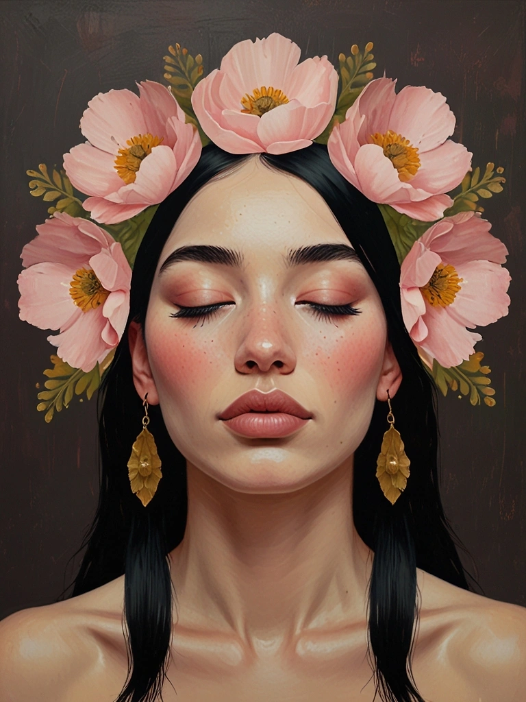 Нежный портрет девушки с закрытыми глазами — воплощение богемного стиля и женственности. Идеальный постер для спальни, гостиной или творческого пространства — элегантный штрих в интерьер.