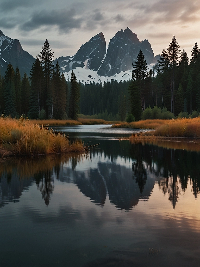 Безмятежное озеро, как глубокое зеркало, отражает величественные горные вершины и густой хвойный лес в золотом свете заката. Композиция погружает зрителя в атмосферу созерцательного спокойствия, где каждый элемент природы находится в идеальной гармонии. Этот постер станет центром внимания в интерьере, привнося чувство умиротворения и связи с нетронутыми экосистемами России.