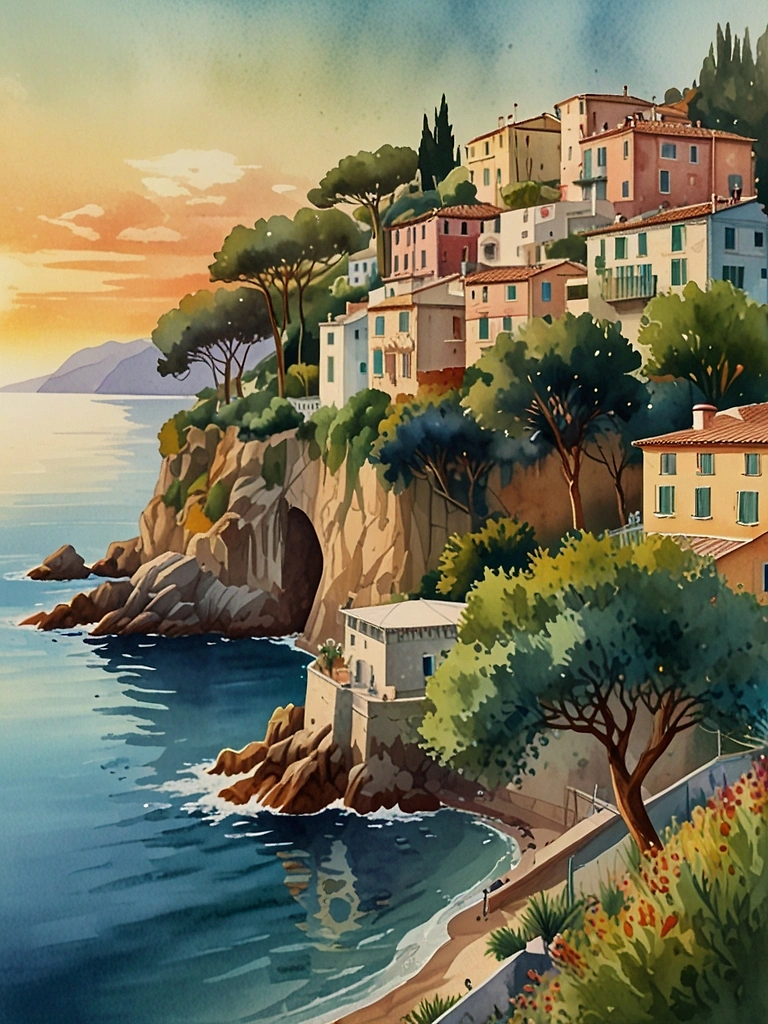 Изысканный акварельный постер с видом на итальянское побережье. Нежные пастельные домики, лимонные деревья и бирюзовое море в теплом свете рассвета создают атмосферу роскошного спокойствия. Премиум-качество для интерьеров в стиле современной элегантности.