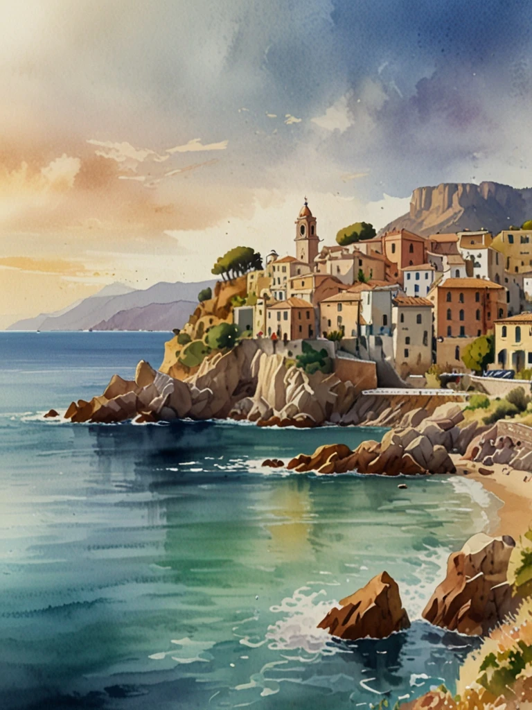 Очаровательная акварель с видом на скалистый берег Южной Италии, омытый теплым средиземноморским солнцем. Мягкие пастельные оттенки и воздушная композиция создают атмосферу спокойствия и элегантности. Идеальный выбор для интерьера, вдохновленного морской романтикой и итальянским стилем.