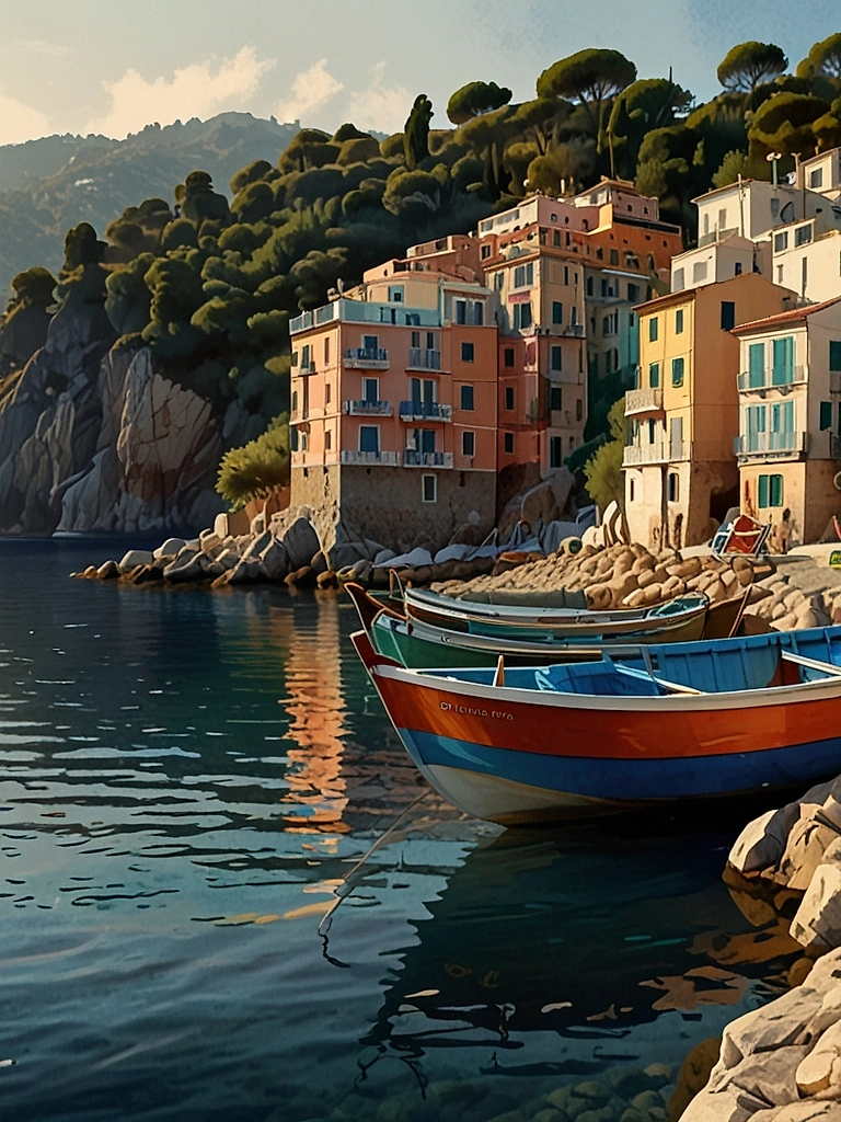 Акварельная композиция, запечатлевшая очарование итальянского побережья в момент захода солнца. Спокойная гавань с рыбацкими лодками, выветренные фасады прибрежных домов и зеркальные отражения на водной глади создают атмосферу умиротворения и элегантности. Этот постер станет идеальным украшением для создания уютного средиземноморского уголка в вашем интерьере, привнеся тепло и аутентичный шарм прибрежной Италии.