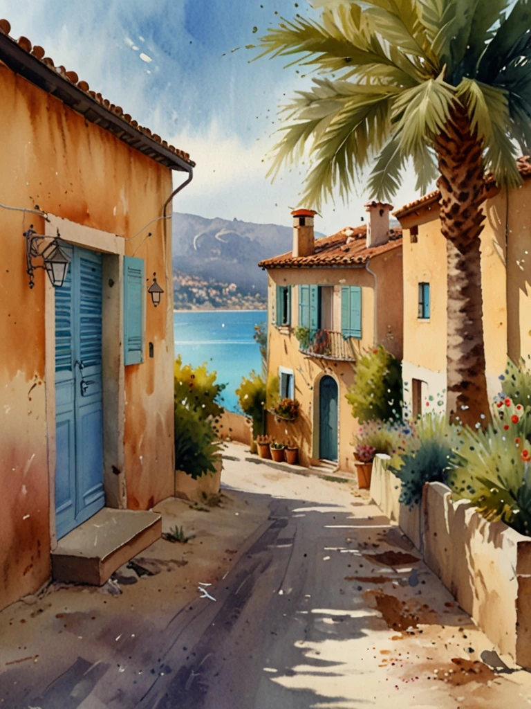 Нежный акварельный пейзаж побережья Средиземного моря с уютной приморской деревушкой, озаренной теплым солнечным светом. Мягкие пастельные оттенки и воздушная композиция создают атмосферу спокойствия и романтики. Идеальное украшение для любого интерьера, дарующее ощущение европейского путешествия.
