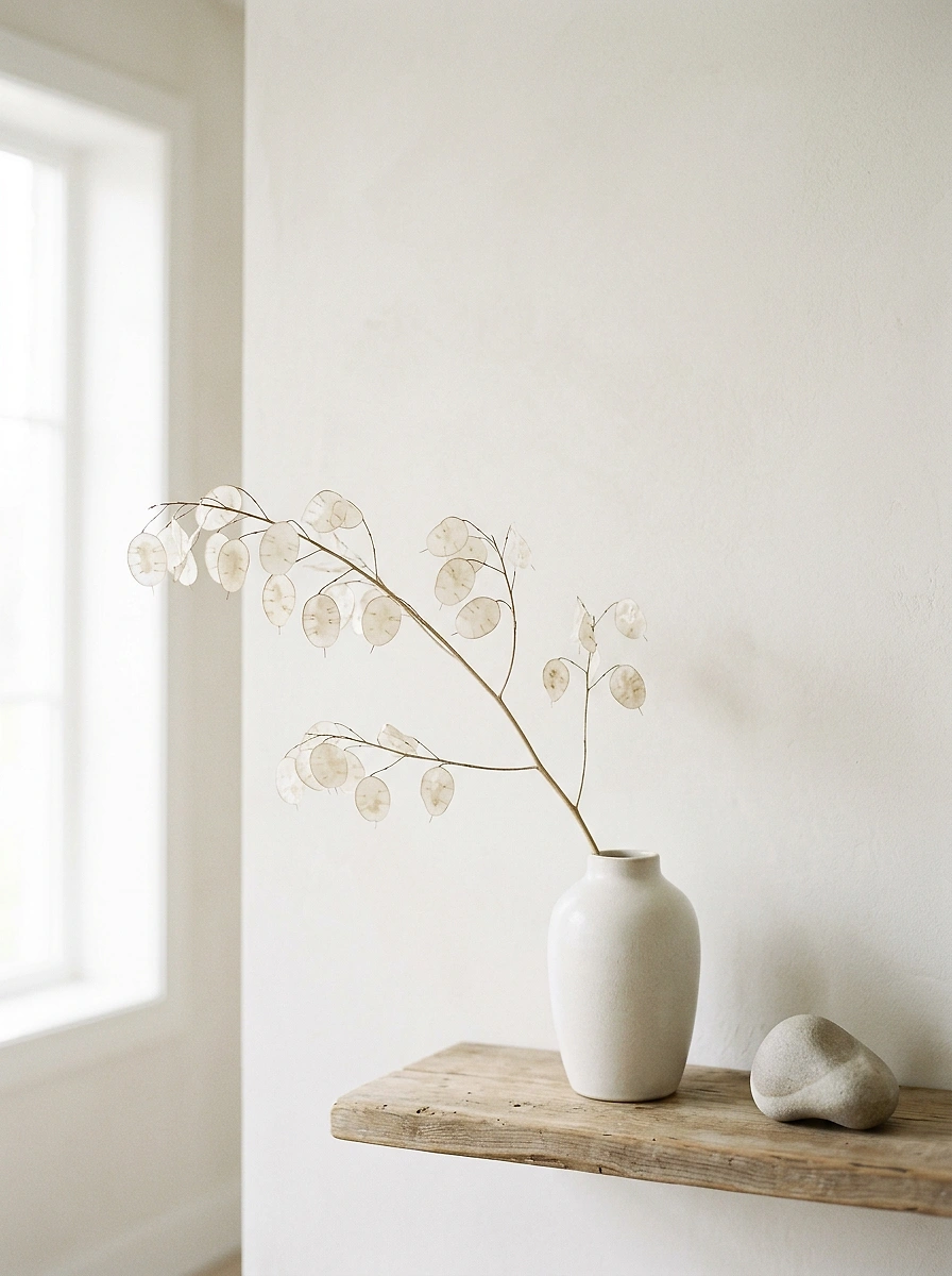 Нежный минималистичный постер, построенный на тишине формы, мягком свете и спокойной природной фактуре. Белая ваза с тонкой ветвью физалиса на деревянной полке создаёт ощущение воздуха, простоты и внутреннего равновесия. Светлая бежево-молочная палитра, деликатные тени и лаконичная композиция делают этот постер идеальным акцентом для спокойного современного интерьера в стиле japandi, scandi или soft minimalism. Подойдёт для спальни, гостиной, кабинета или уютного светлого пространства, где важны тишина, чистота и визуальное спокойствие.